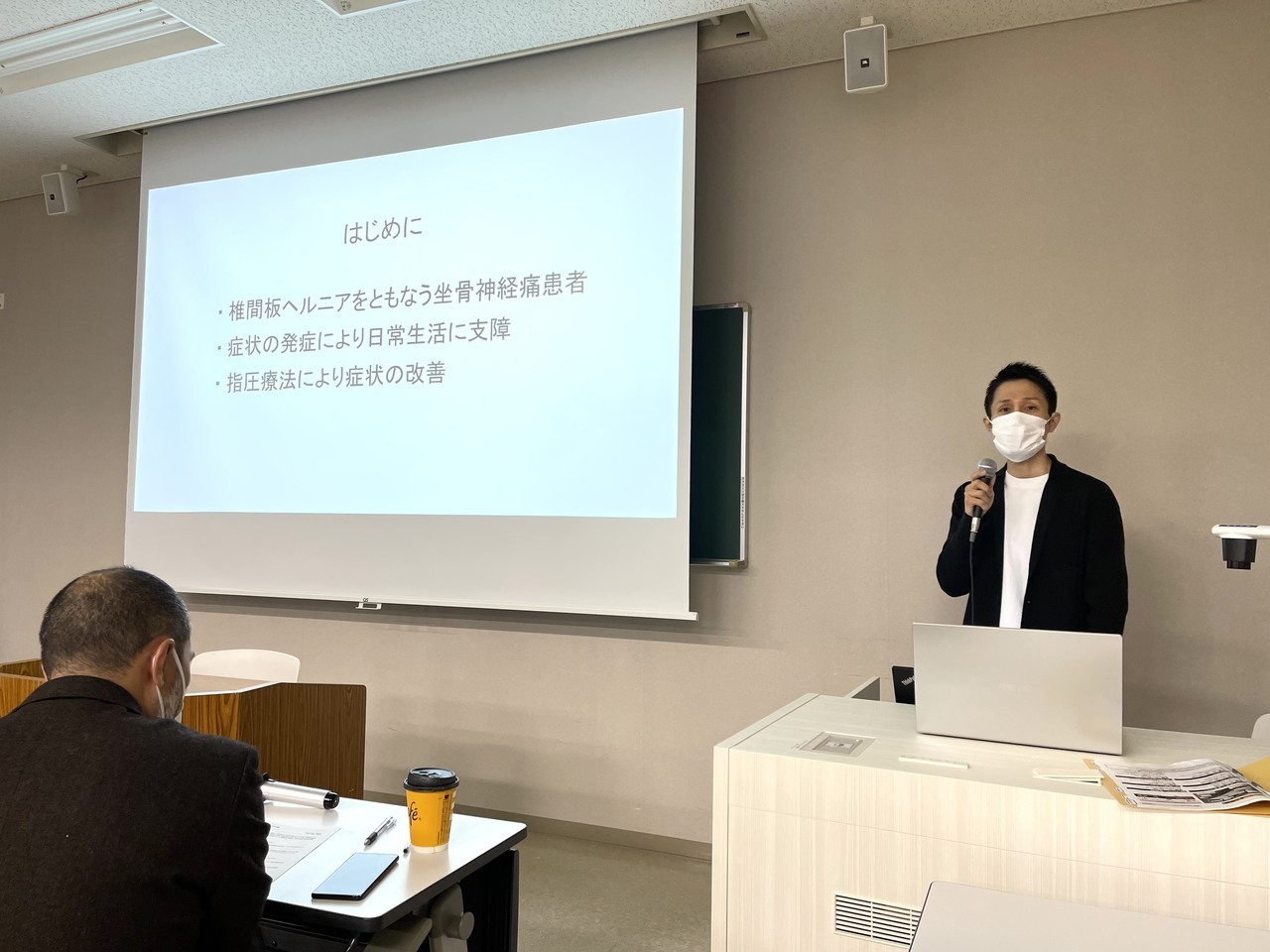 2022年に開催された日本指圧学会で、椎間板ヘルニアの症状のひとつでもある「坐骨神経痛に対する指圧治療」を症例発表しました。