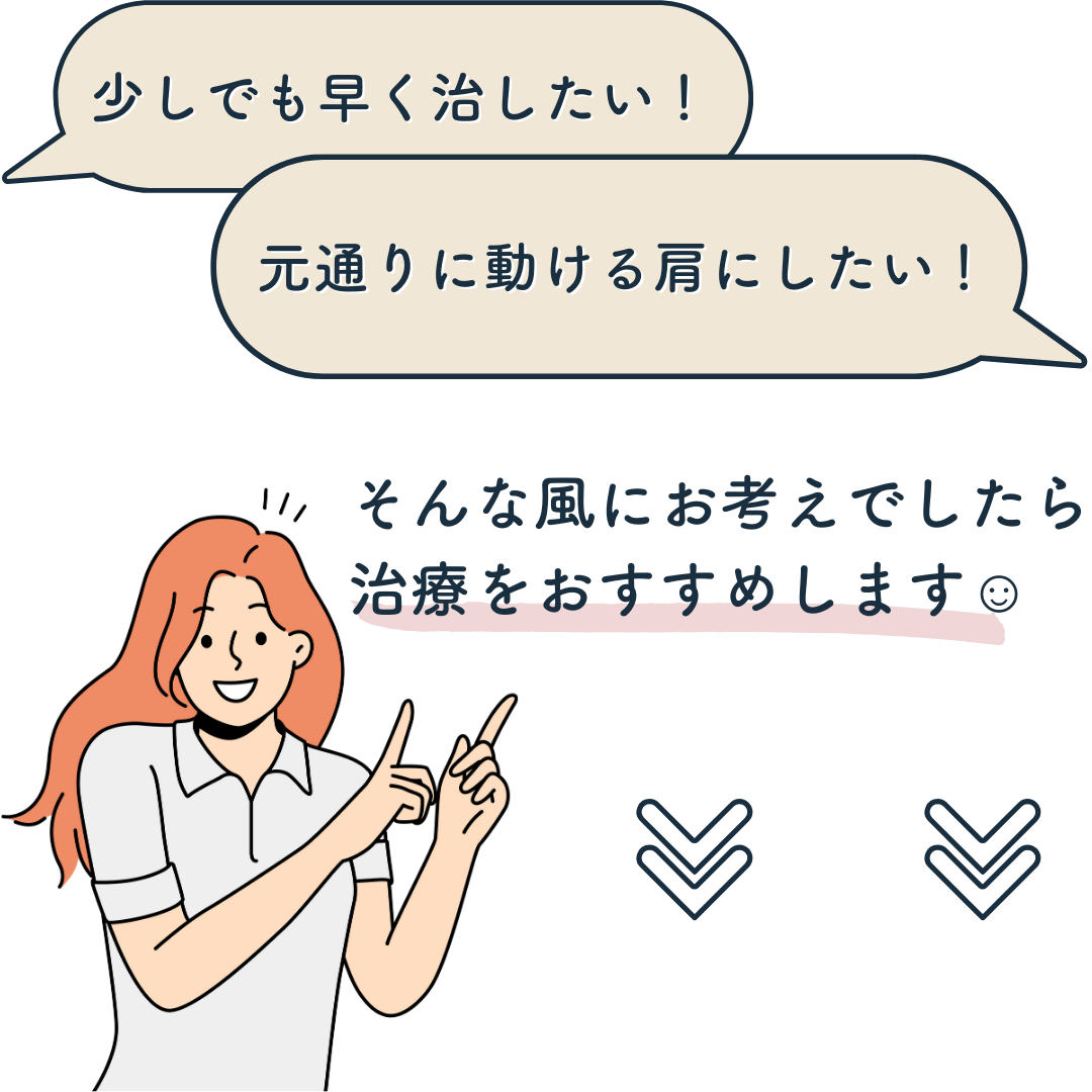 動かすと痛いですが、あまり長期間動かさないでいると肩の可動域がかえって制限されてしまいます。