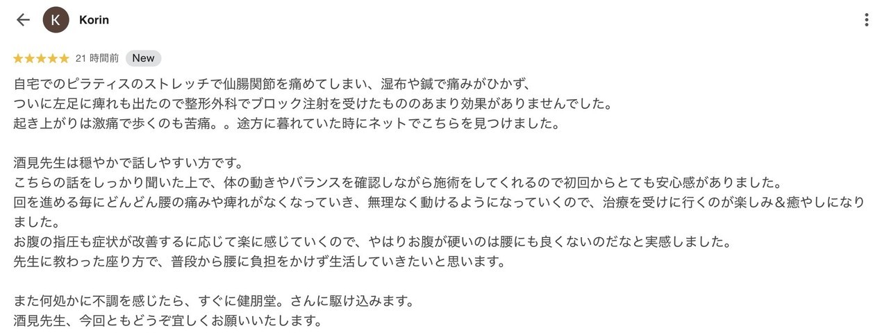 こちらの話をしっかり聞いた上で、体の動きやバランスを確認しながら施術してくれるので初回からとても安心感がありました。