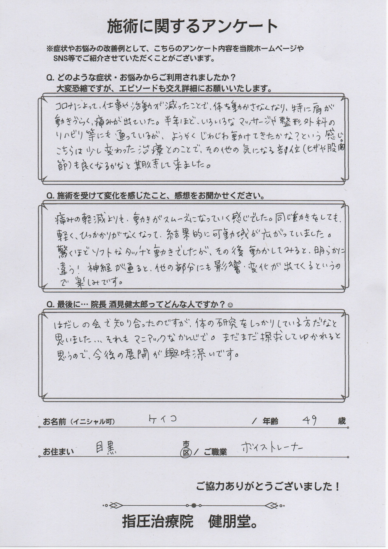「コロナによって、仕事や活動が減ったことで、体を動かさなくなり、特に肩が動きづらく、痛みが出ていた。半年ほど、いろいろなマッサージや整形外科のリハビリ等にも通っているが、ようやくじわじわ動けてきたかなと?という感じ。こちらは少し変わった治療とのことで、その他の気になる部位(ヒザや股関節)も良くなるかなと期待してきました。」
